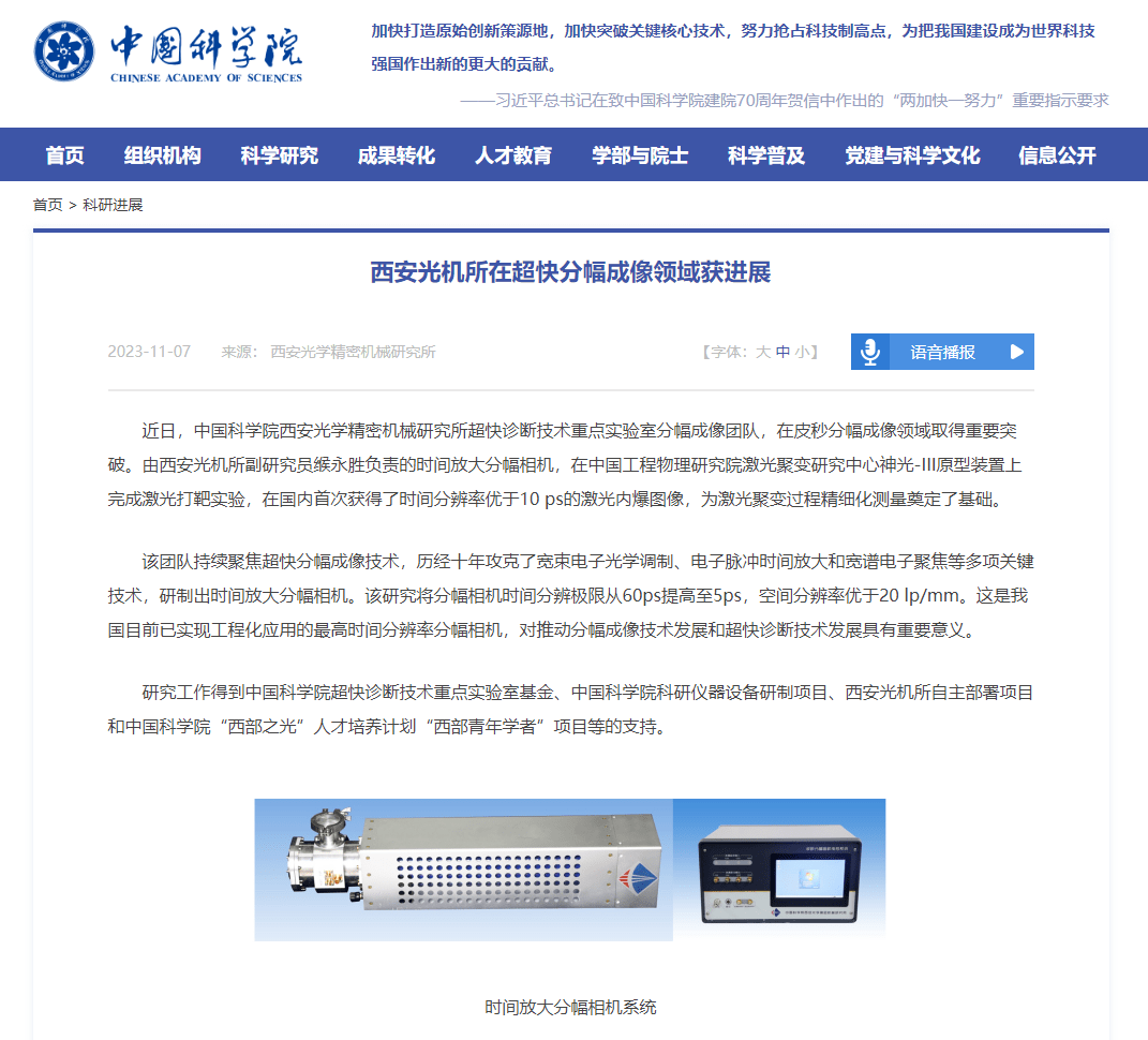 据介绍,由西安光机所副研究员缑永胜负责的时间放大分幅相机,在中国工程物理研究院激光聚变研究中心神光-III 原型装置上完成激光打靶实验,在国内首次获得了时间分辨率优于 10 ps 的激光内爆图像,为激光聚变过程精细化测量奠定了基础。
