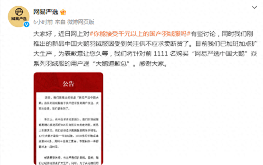 “新品受到追捧,也出乎我们的意料。”网易严选在公告中提到,目前正加班加点扩大生产。为了表达歉意,将选取11月6日9点起的前1111个购买“网易严选中国大鹅”焱系羽绒服的用户赠送“大鹅道歉包”。