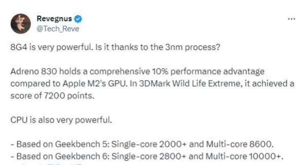根据数码达人Revegnus提供的3DMark Wild Life Extreme跑分透露,骁龙8 Gen4图形得分在7200分左右,要比苹果M2高出10%(搭载M2芯片的Mac Mini 2023跑分在6800~6925分左右),也就是在GPU方面,安卓超越苹果了。