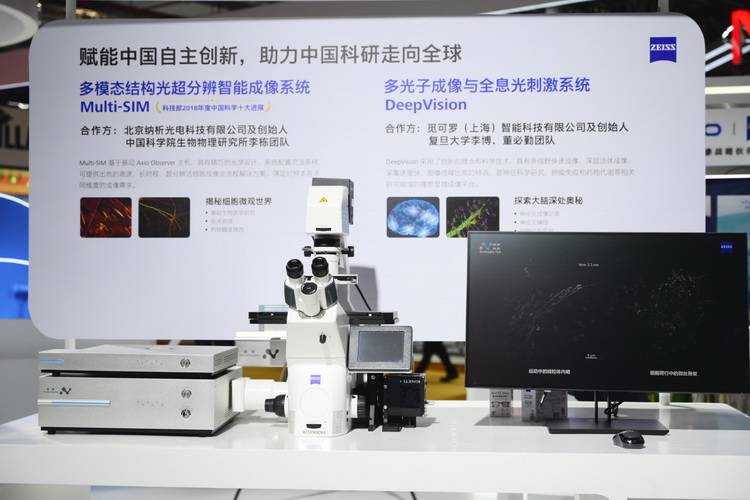 医学领域也是蔡司强悍之一,展台上介绍了Multi-SIM、DeepVision,Multi-SIM是一套面向基础生物医学、临床病理、药物精准筛选等研究,所准备的高速、长时程、超分辨活细胞成像全流程解决方案;DeepVision则是多光子成像与全息光刺激系统DeepVision,由蔡司和复旦大学李博、董必勤团队创立的觅可罗(上海)智能科技有限公司合作推出,能够满足模式大动物神经科学研究对显微成像深度、速度和信噪比的高要求。