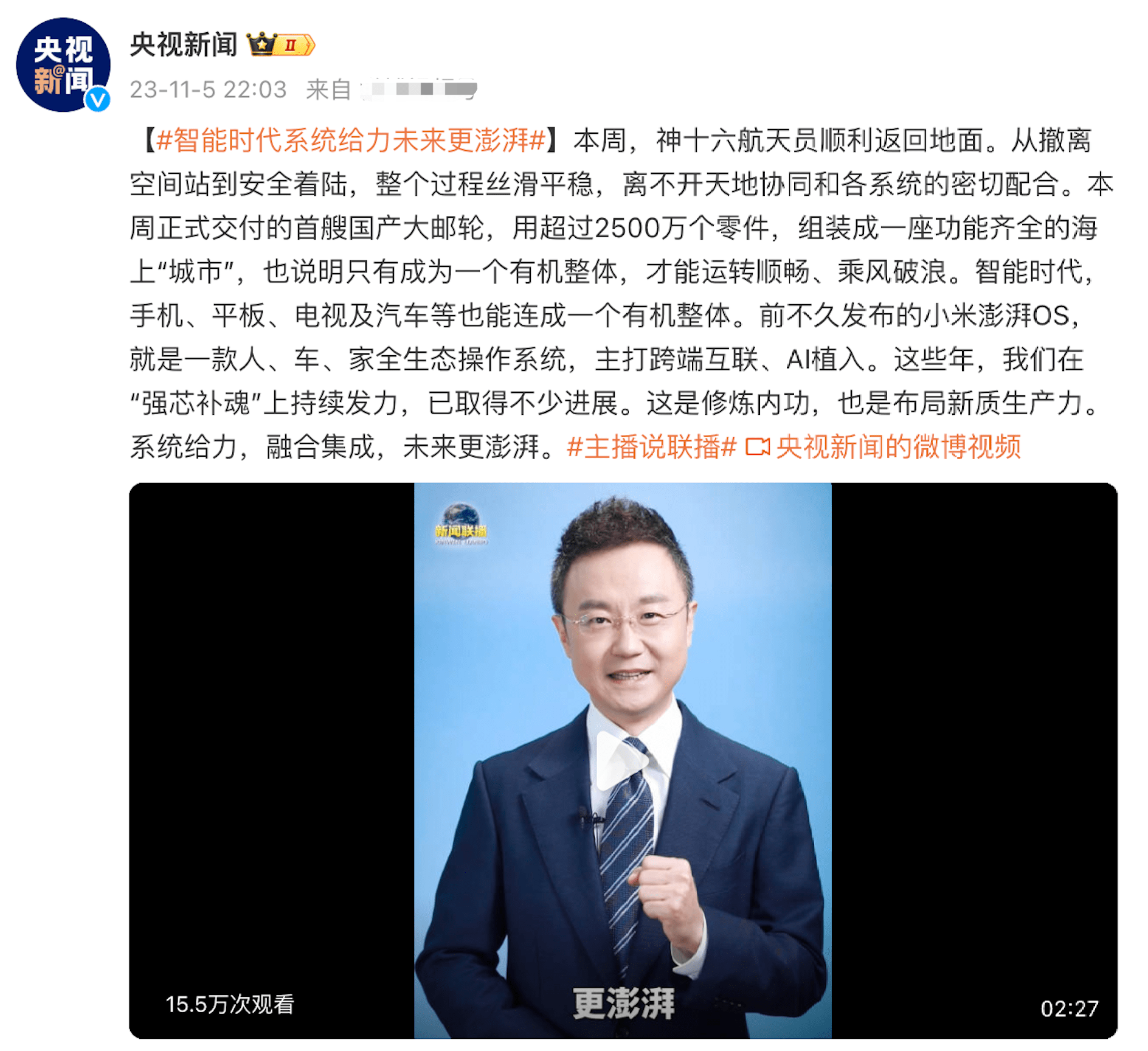 在软件方面,小米14全系都完成了升级,搭载的是全新自研小米澎湃OS系统,要知道,这款操作系统,不仅推动了万物互联时代的进步,更加快了AI端侧大模型在手机端的落地。央视也多次点赞表扬小米澎湃OS系统,引领了中国操作系统的发展和进步。