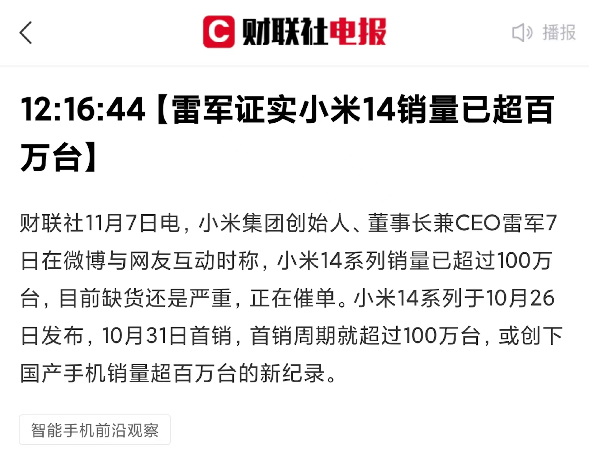 尽管卢伟冰在小米14系列发布前曾透露,首批备货相当充足,但目前小米14系列依然供不应求,且销量也创造了国产手机的新历史,小米14系列也是销量最快突破百万的国产机,太炸裂了!能与之匹敌的,或许只有苹果了。