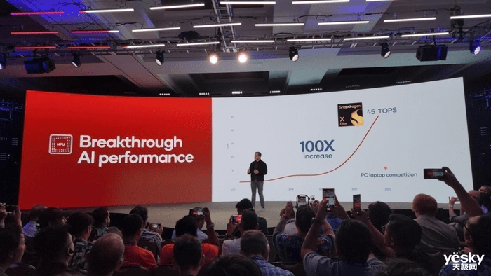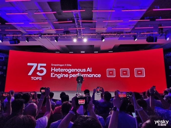 骁龙X Elite同样专为AI打造。作为一款高度集成的SoC芯片,骁龙X Elite内置了新一代Hexagon NPU,算力达到45TOPS,是第三代骁龙8cx的三倍,运行70亿参数大模型时,每秒可以生成30个tokens。它还支持终端侧运行超过130亿参数的生成式AI模型,AI处理速度是竞品4.5倍,面向Windows 11 PC的终端侧聊天助手可实现每秒处理30个token。同时骁龙X Elite整合NPU、CPU和GPU的能力,异构AI引擎使其算力达到了75TOPS。