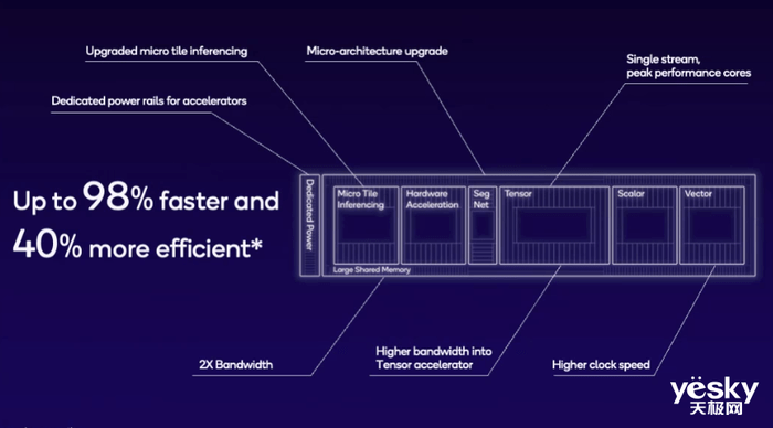 全新异构架构的高通AI引擎是第三代骁龙8的AI性能卓越原因之一。Hexagon NPU升级了全新的微架构,性能提升了98%,能效提升了40%。Hexagon NPU集成了硬件加速单元、微型区块推理单元、性能加强的张量/标量/矢量单元,同时所有单元共享2倍带宽的大容量共享内存。