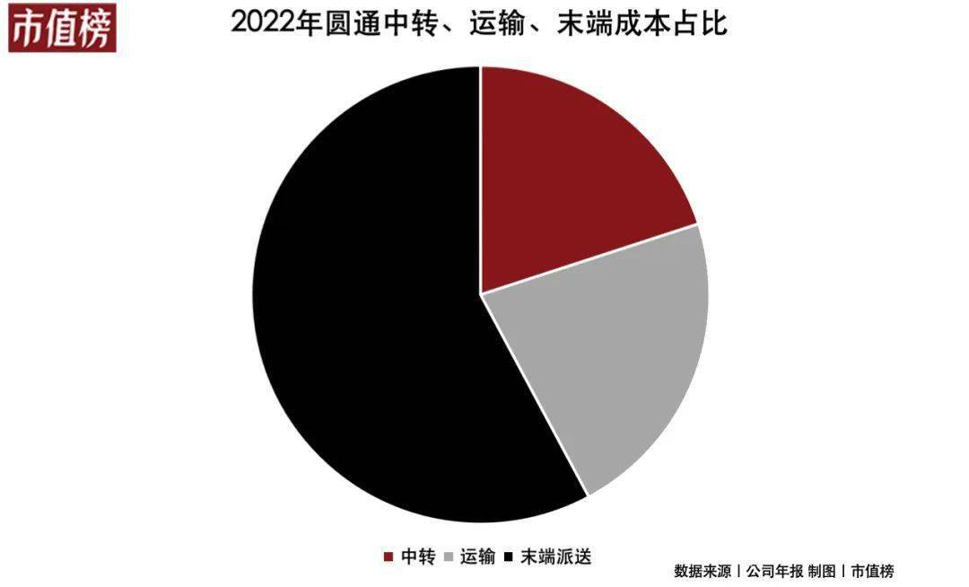 成本管控主要取决于三个环节,中转、运输和末端派送,以圆通为例,2022年三个环节的单票成本分别为0.46元、0.51元、1.33元。其中,末端派费成本占比超过一半,达到57%,对比上一年增幅也最大,达14.7%,而分拣和运输成本则整体变化不大。