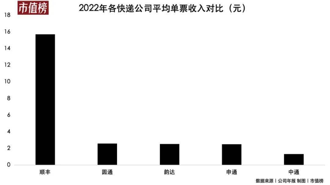 电商件的单票收入远低于商务件的单票收入,比如2022年,顺丰的平均单票收入为15.73元,而圆通、韵达、申通、中通的单票收入分别只有2.59元、2.55元2.52元、1.34元。