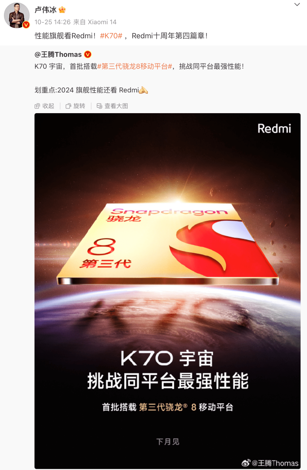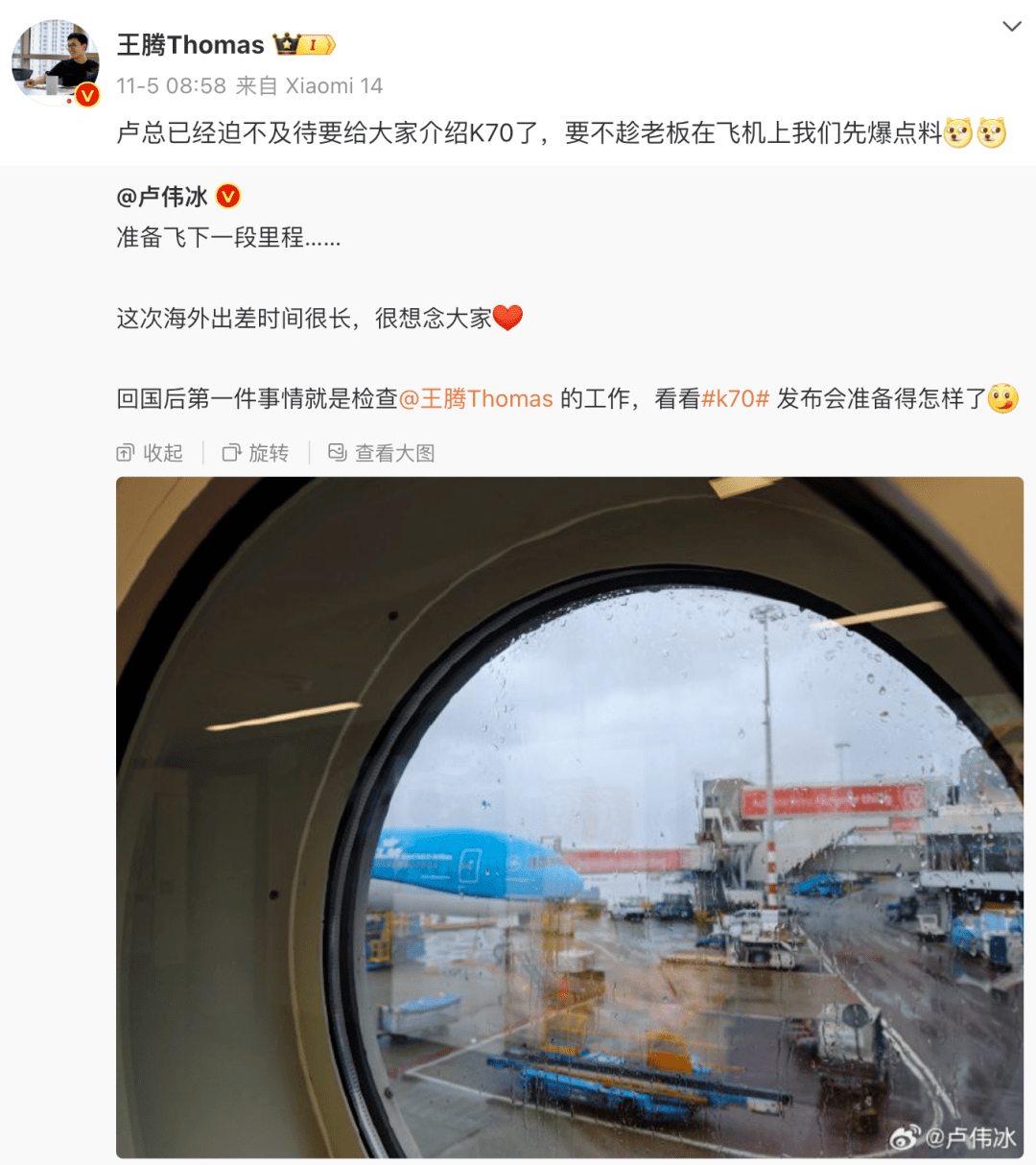 上个月Redmi K70宇宙宣布将首批搭载骁龙8Gen3,将于11月发布。现在11月已经过去了一周,卢伟冰也刚刚结束了海外出差,开始备战Redmi K70系列发布会。