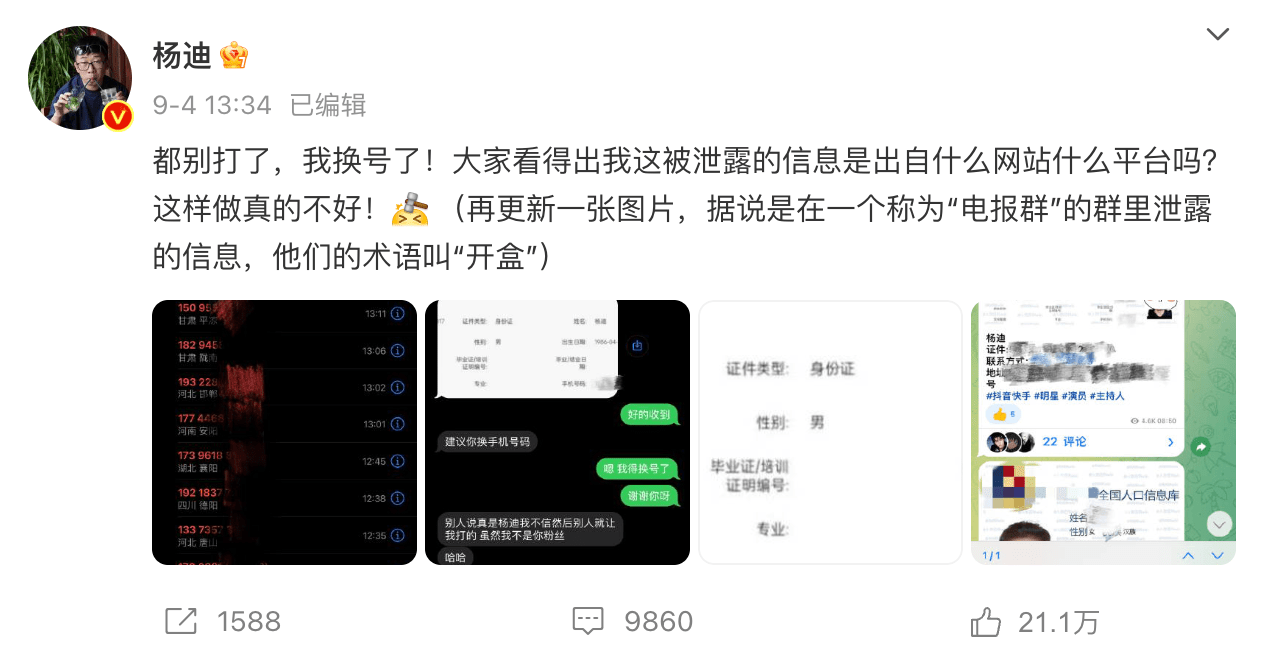 吓人,就连明星也逃不过隐私泄露?众所周知,明星对于隐私保护还是挺到位的,但前段时间杨迪发文表示自己的信息被泄露了,手机号码也被曝光了出来,导致不得不换号了,而且除了杨迪以外,包括有赵露思、王一博、鹿晗、王源、金星等多位明星的信息,也遭到了泄露。如果是普通人的话,那信息泄露估计就更严重了。