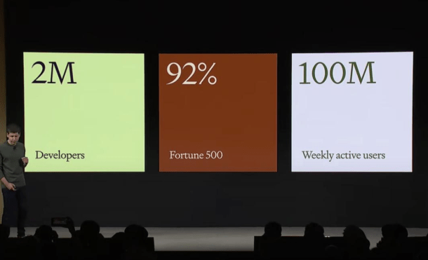 此次大会上,OpenAI的首席执行官萨姆·阿尔特曼向外界晒出了公司最新的成绩单:ChatGPT的周活用户数达到1亿人,已经有200万开发者正在使用OpenAI的API(应用程序接口),92%的财富500强公司正在使用OpenAI的产品搭建服务。