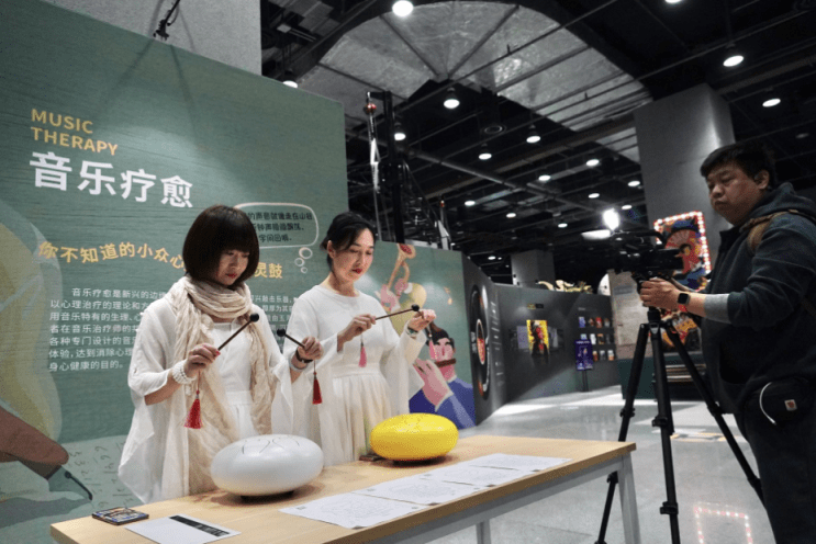 最引人遐思的莫过于第四展区“未来音乐厅”。一件名为“宇宙八音盒”的展品让不少观众驻足。乍眼一看,它不过是一个平平无奇的立方体。“这是宇宙八音盒的地球装置,是乐器的发声端;还有一部分太空装置,主体是一个装有红球的透明六面体,是乐器的输入端。”张瑶解释,置身太空中的红球的每一次微小运动都会被精确捕捉,通过对相关数据进行合成,观众便能在展厅内听到来自宇宙的声音。磁流体音箱带来的视觉效果同样震撼:伴随着音乐的旋律,音箱内黑色的磁流体不断变化着形状。张瑶说,磁流体是一种浑身带“刺”的神奇液体,当磁铁靠近它就会有尖刺产生;该装置将音乐旋律与磁流体的这一特征建立联系,实现了音乐的可视化。同一展区里,观众还可以戴上设备,静心冥想,即兴创作一首脑电波协奏曲。