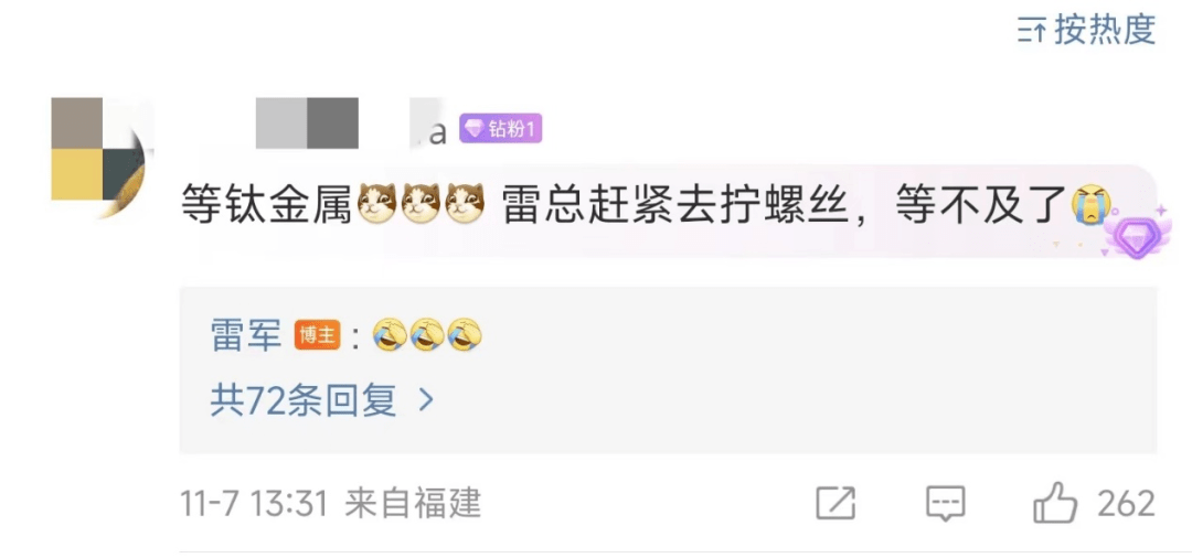 除了线下门店销售的机型,小米14Pro还有一款钛金属特别版,售价6499元。小米之家店员告诉记者:“钛金属特别版只在线上有卖,线下门店是没有的。”在微博上,也有网友表示:“等钛金属,雷总赶紧去拧螺丝,等不及了。”而雷军回复该网友捂脸笑哭的表情包。