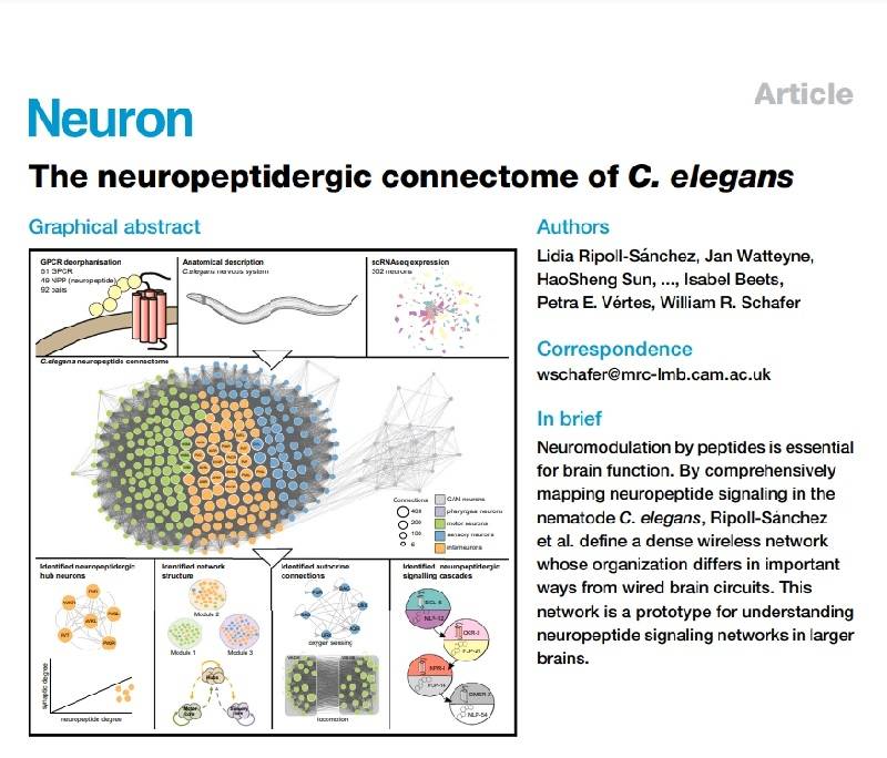 此前,还没有人成功地在动物中建立起神经肽的网络通信图。此次研究的对象是秀丽隐杆线虫。这种蠕虫的神经系统在解剖学上很小,但在分子水平上,它的神经肽系统非常复杂,与更大的动物有显著的相似之处,它的突触连接体显示出许多在更大的大脑中保守的特征。研究人员估计,蠕虫的神经肽连接体可作为理解更大神经系统中的无线信号的原型。