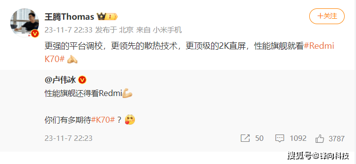好玩的是在iQOO 12系列发布会结束之后,卢伟冰在微博表示:性能旗舰还得看Redmi,你们有多期待Redmi K70系列。随后Redmi产品经理王腾转发了卢伟冰的这条微博,说到:更强的平台调校,更领先的散热技术,更顶级的2K直屏,性能旗舰就看Redmi K70。