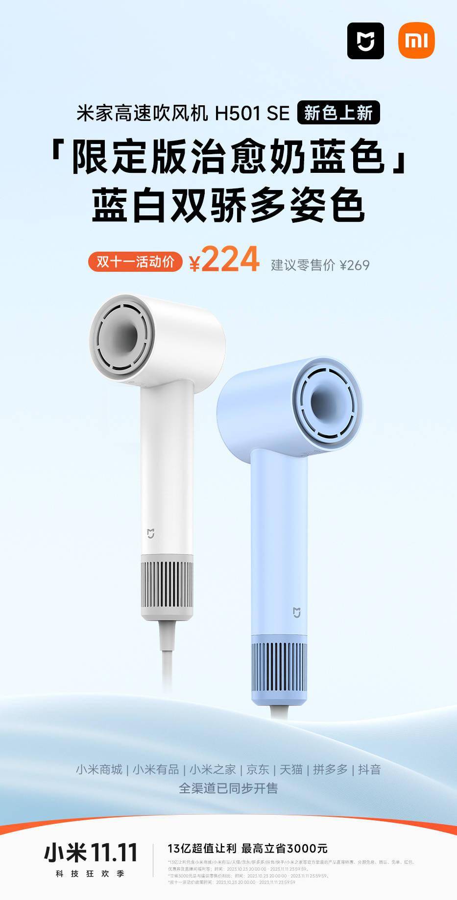 IT之家 11 月 8 日消息,小米在今年 9 月推出了米家高速吹风机 H501 SE,首发价 249 元。这款吹风机虽然宣传图给出了白色和蓝色两种版本,但蓝色型号直到最近才上架。