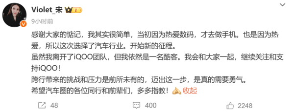 在发布会结束后不久,宋紫薇在个人微博发文,她表示:“感谢大家的惦记,我其实很简单,当初因为热爱数码,才去做手机。也是因为热爱,所以这次选择了汽车行业,开始新的征程。虽然我离开了iQOO团队,但我依然是一名酷客。我会和大家一起,继续关注和支持iQOO!跨行带来的挑战和压力是前所未有的,迈出这一步,是真的需要勇气。希望汽车圈的各位同行和前辈们,多多指教!”
