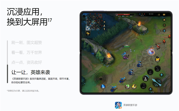 华为Mate X5还联合《英雄联盟手游》、《金铲铲之战》等诸多热门手游进行大屏适配,相同场景下提供更大视野的画面显示效果,各类角色、技能、装备辅助栏也一目了然。