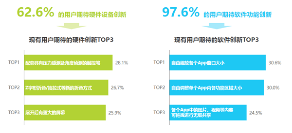 近日,根据艾瑞咨询最新发布的《2023年中国折叠屏手机用户洞察报告》(以下称:《报告》)显示,97.6%的折叠屏手机现有用户更期待软件方面的创新。对于手机界面APP的灵活调控,如APP窗口大小的自由缩放、APP内各功能区域大小的自由调整和APP之间图片、视频拖拽共享等操作仍抱有更高的期待。