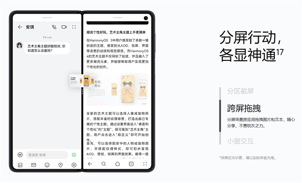于此同时,华为 MateX5还支持智慧多窗功能,可以一步实现分屏或悬浮窗,在同一块屏幕上可以运行多个 APP。华为Mate X5还支持“跨屏拖拽”,两个应用在分屏显示状态下,用户可以直接将其中一个APP中的图片等素材拖拽到另一款APP中,一步搞定传输操作,极大的提升了日常工作效率。