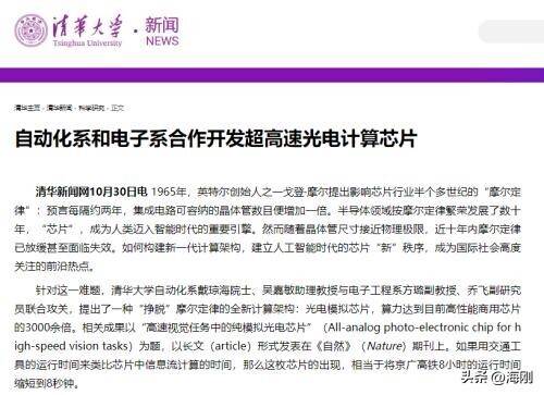 根据清华大学官方网站显示,清华大学电子工程系与自动化系联合,摆脱了摩尔定律,打造出了全新光电模拟芯片,算力达到了目前高性能商用芯片的3000多倍!目前该论文已经发表在了《自然》杂志。
