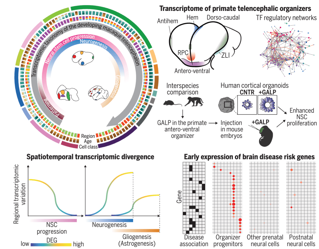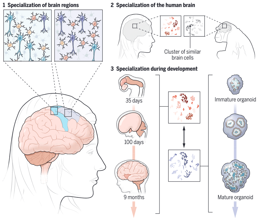 这些研究着重于对人体及非人灵长类动物大脑细胞组成进行单细胞比较分析。由此我们得知,一些将人类与灵长类动物区分开来的变化,导致了更高的认知能力,但也使我们面临更大的疾病风险,通过了解这些差异可以解开疾病风险的原因。
