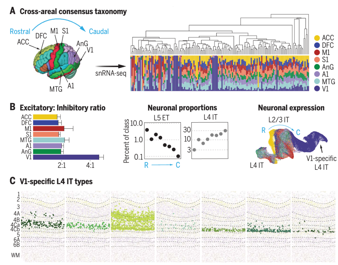 有趣的是,初级视觉皮层(V1)似乎是个例外:V1区拥有几种特异性的抑制性神经元类型,是人类和其他灵长类动物在这一区域特有的[3](图4)。总体而言,这些数据支持区域功能多样化的进化策略,该策略在很大程度上不依赖于新细胞类型的产生,而是利用细胞类型内的微小变化及其相对分布的变化来构建不同的环路。