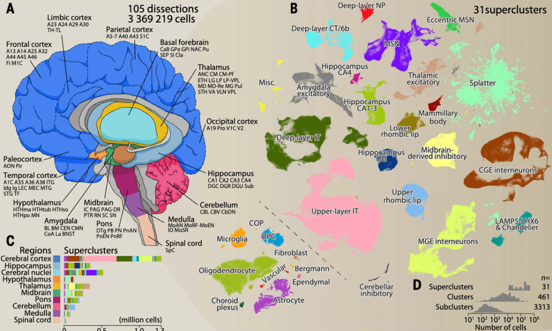 第一个研究由瑞典卡罗林斯卡医学院Sten Linnarsson和荷兰乌得勒支大学医学中心的神经科学家Kimberly Siletti团队领衔[2]。他们从三位死者的前脑、中脑和后脑106个部位采集了300多万个单一细胞进行RNA测序(snRNA-seq),深入研究了脑细胞的多样性和亚型,为整个图谱的建立打下坚实的基础。