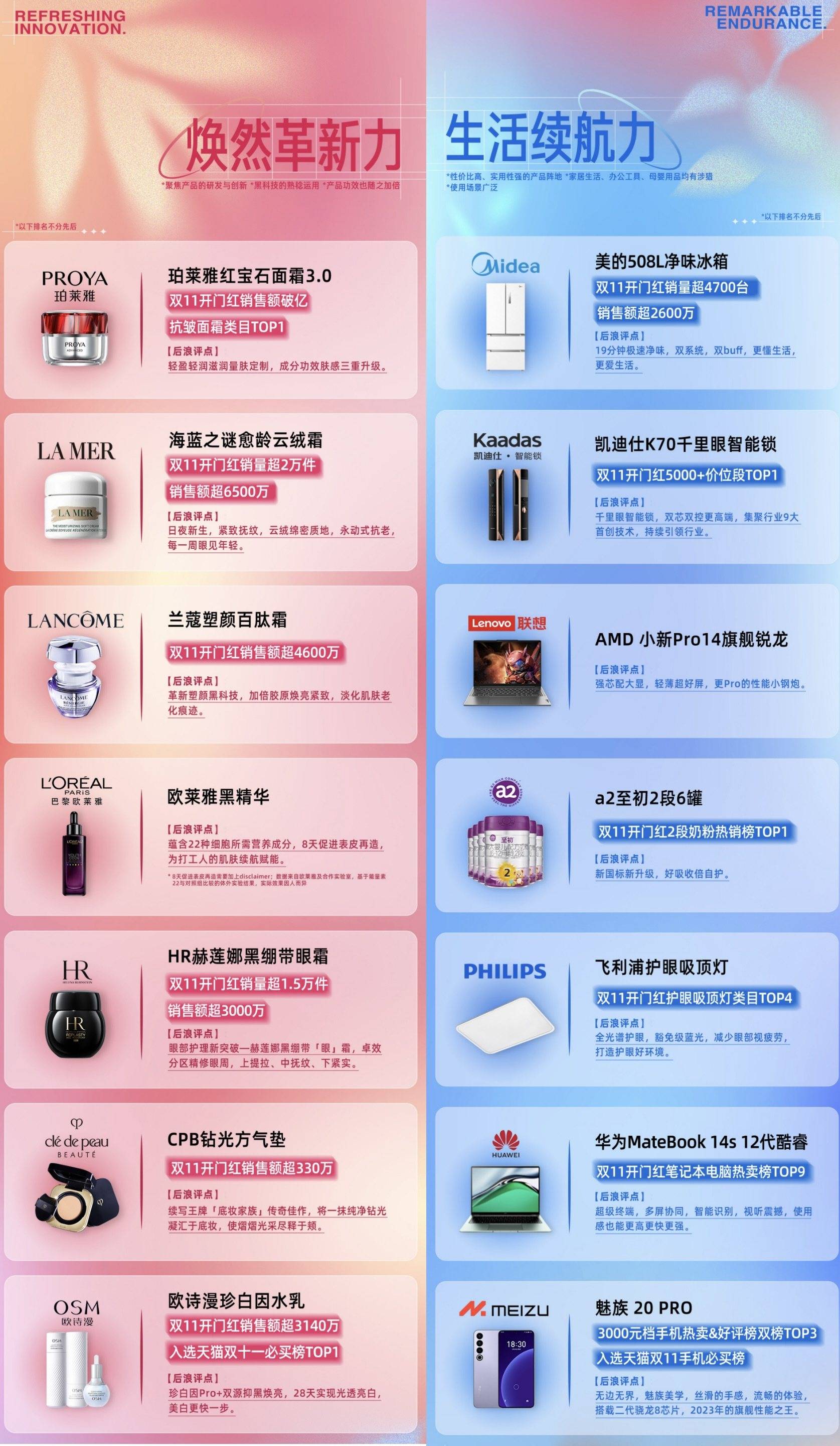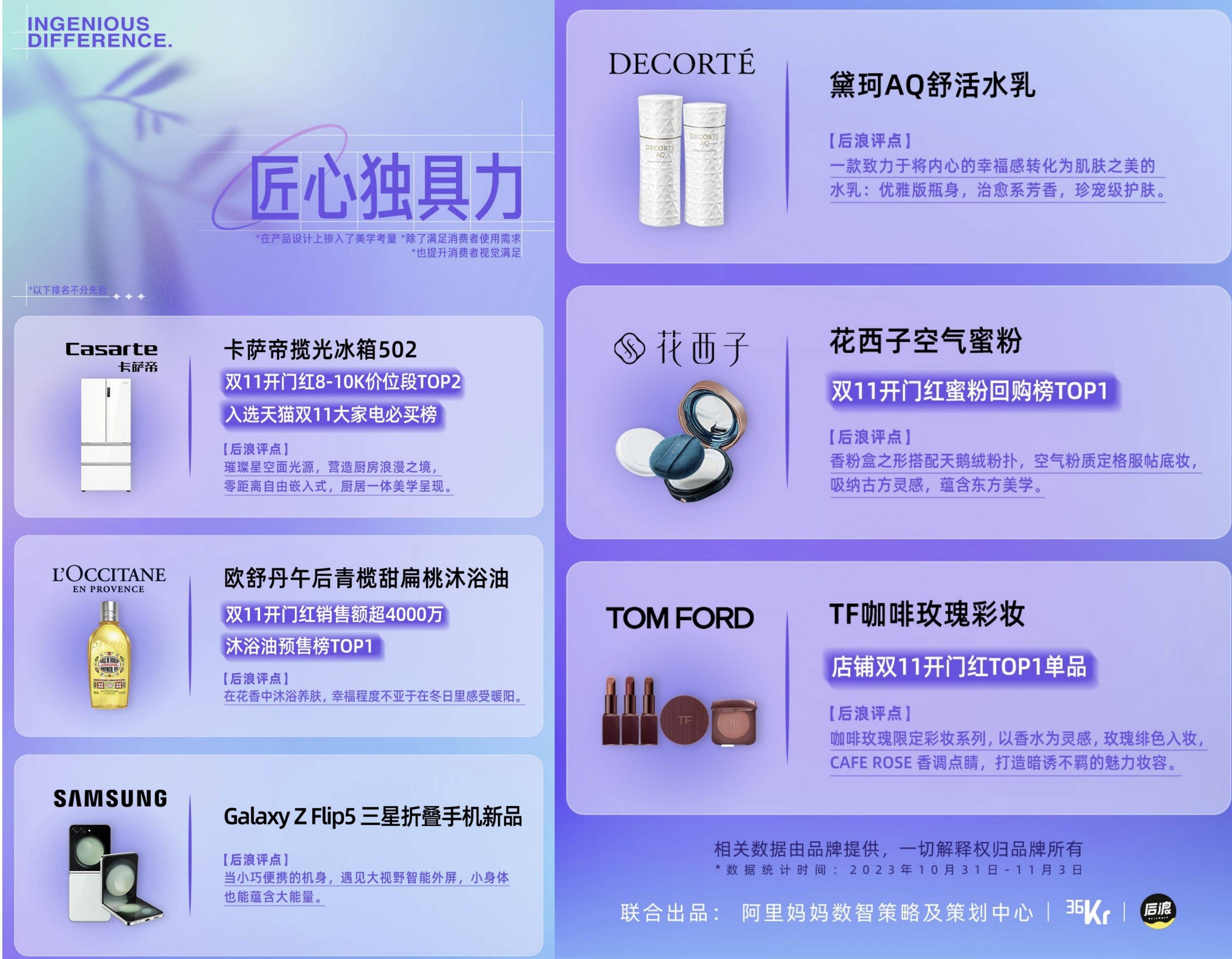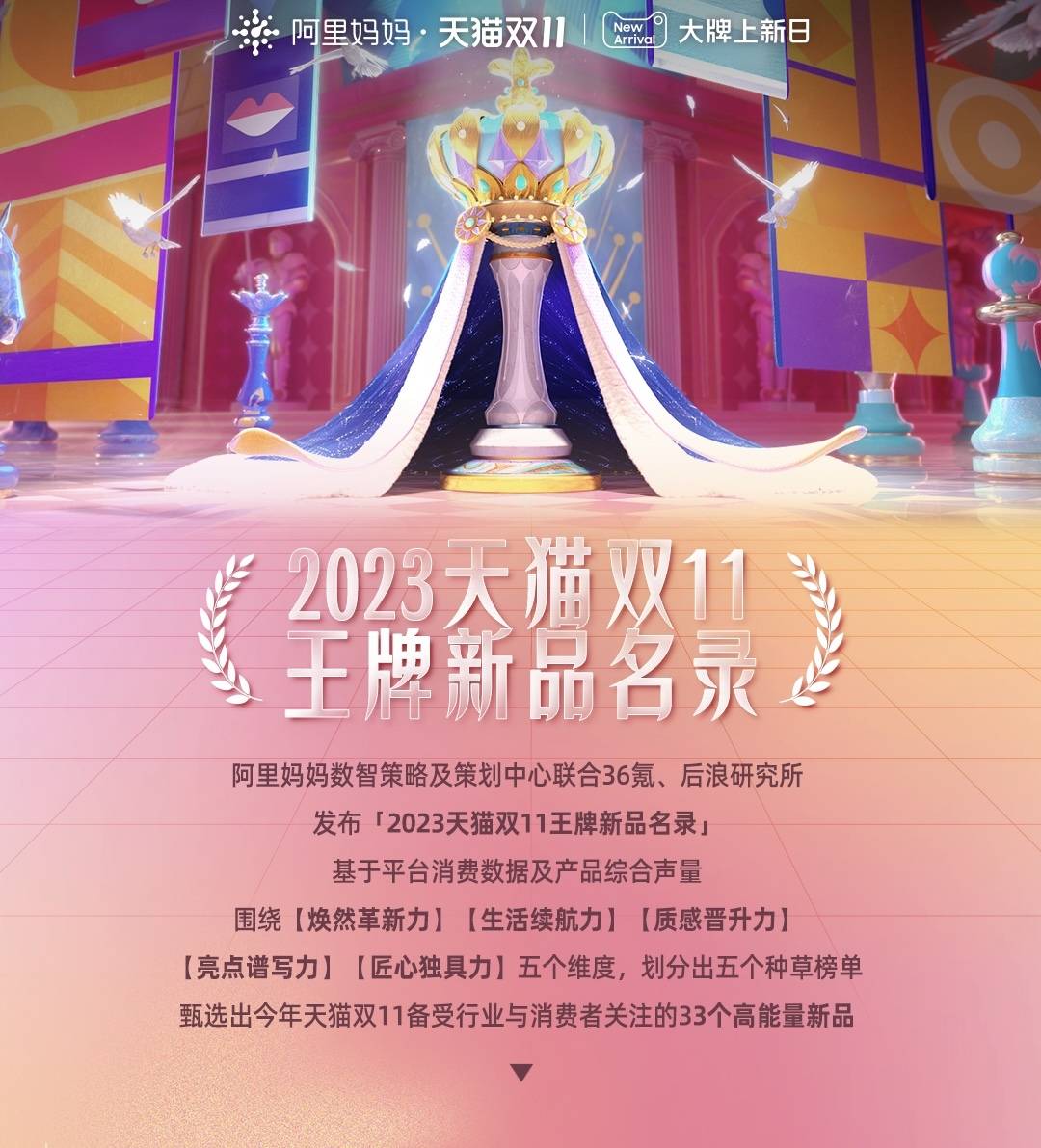 或许,从这张阿里妈妈数智策略及策划中心联合36氪、后浪研究所发布的“2023天猫双11王牌新品名录”里,从被甄选出的今年双11备受行业与消费者关注的33个新品中,能找到答案。