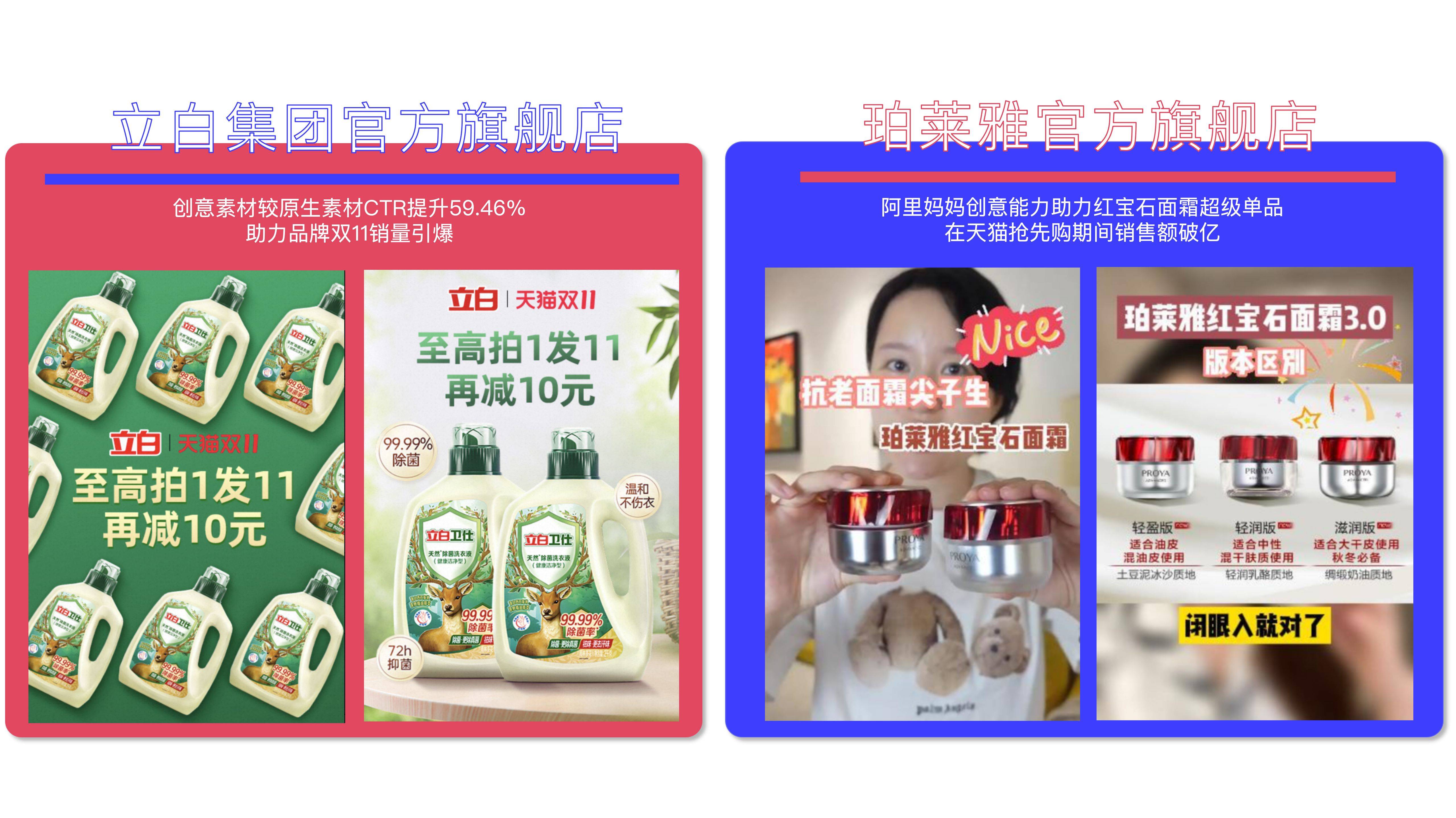 本次双11期间,阿里妈妈创意中心特设创意能力权益反哺,在“人群X创意序列化”能力支持下,通过创意趋势洞察、智能混剪工具,立白的广告投放素材点击率提升59.46%;结合阿里妈妈大客计划AIO,创意中心为珀莱雅核心单品“红宝石面霜3.0”打造专属特秀,素材点击率同比提升35.1%。