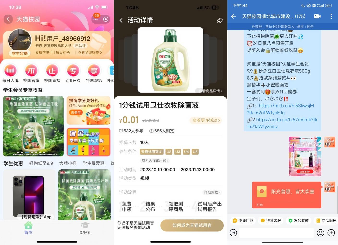 今年,王牌新品计划的一大升级之处在于,联合站内新品试用、天猫校园、站外什么值得买三大线上线下平台,通过产品众测、达人测评和好价爆料清单等方式触达对大促感兴趣的优质购买力人群和大学生年轻群体。缺乏市场认知的新品,得以被全网扩散,为品牌新品触达更多潜在消费者。双11期间,立白卫仕除菌洗衣液试用装,通过店铺会员、天猫校园、新品试用等渠道派样超过3万件,曝光量超10万,触达了大量精致妈妈、新锐白领等目标人群,有效将“植物除菌”品牌理念传达给大众,增加品牌品类资产人群。