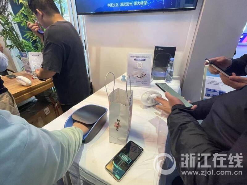 不止心理健康,在未来,中医线上看诊也可以通过AI实现。在AI中医把脉展区,观众扫码后,将手伸进智能中医体检仪中,2分钟后系统就会将健康报告发送至手机——“胃虚7.7,胆虚7.8,血虚7.0……”。“它模拟的是中医的望闻问切,可以提供60多项数据检测。”杭州八脉科技有限公司市场经理范冲说,AI中医把脉采集了中医的经验集成,把脉结果更精准,能实现患者在家看病问诊。