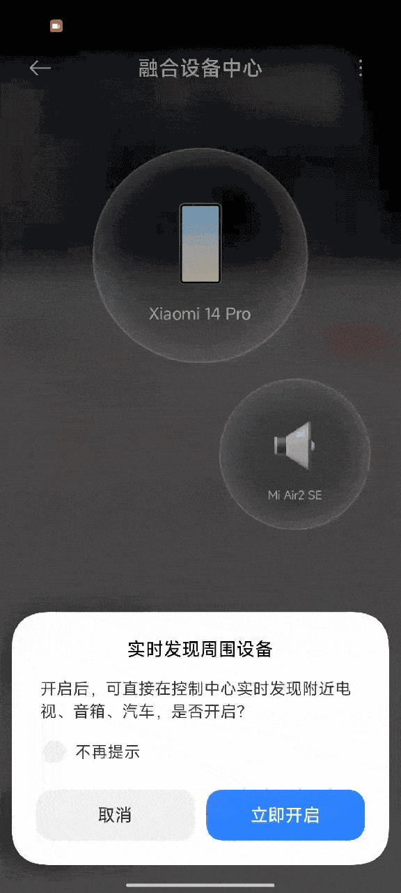 相比MIUI,HyperOS将互联互通功能的优先性提高了。MIUI的妙享中心位于通知栏下方,HyperOS将它上移,放在了音量控制下方,并更名为“融合设备中心”。