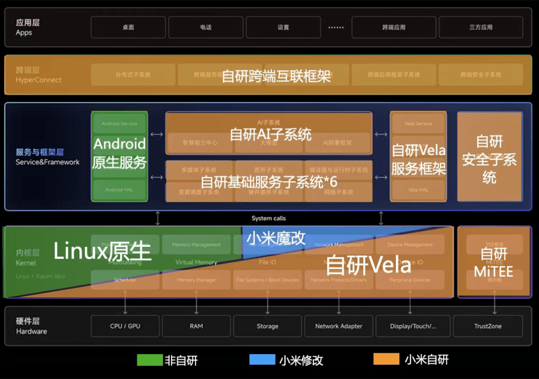 MIUI是深度定制的安卓系统,而HyperOS的底层技术更复杂一些,下面这张图比较清晰地展示了HyperOS的结构。
