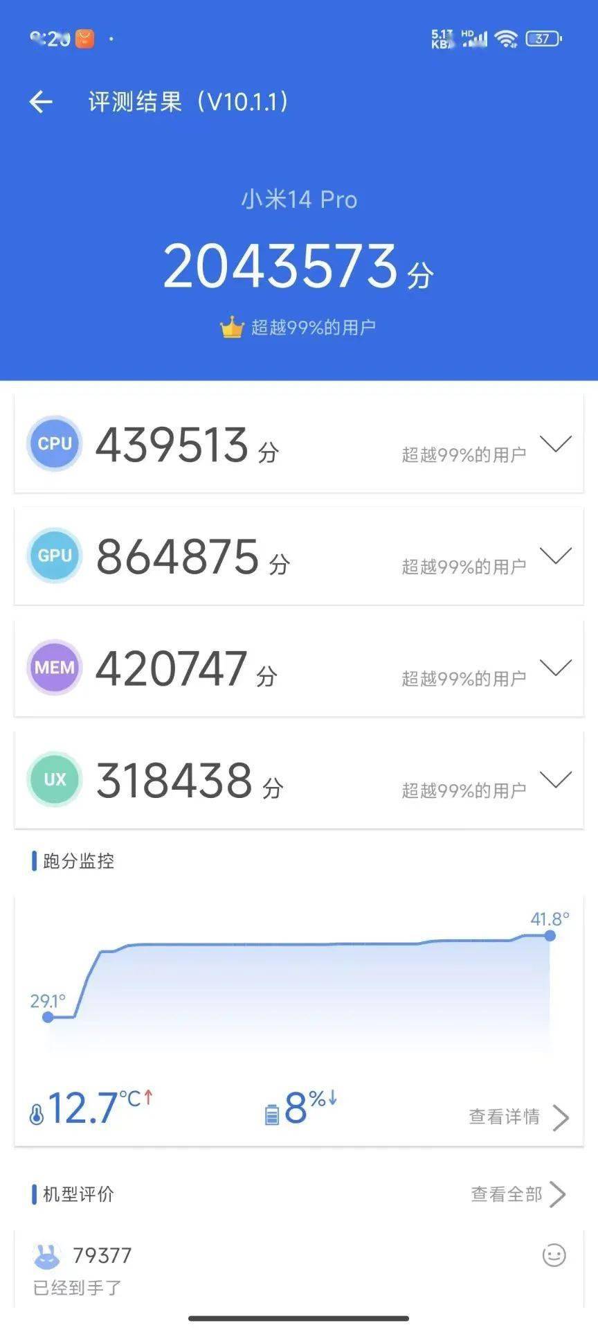 性能测试环节上,实测小米14Pro的安兔兔跑分达到了204万,成功登顶安卓旗舰,小米14则超过了190万。