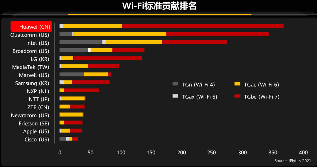 根据 2021 年的公开报告显示,在 Wi-Fi 7 的标准制定过程中,华为所贡献的标准数量排名全球第一。而从 Wi-Fi 4 到 Wi-Fi 7 的整体贡献标准数来看,华为的累积贡献标准数也是全球第一。