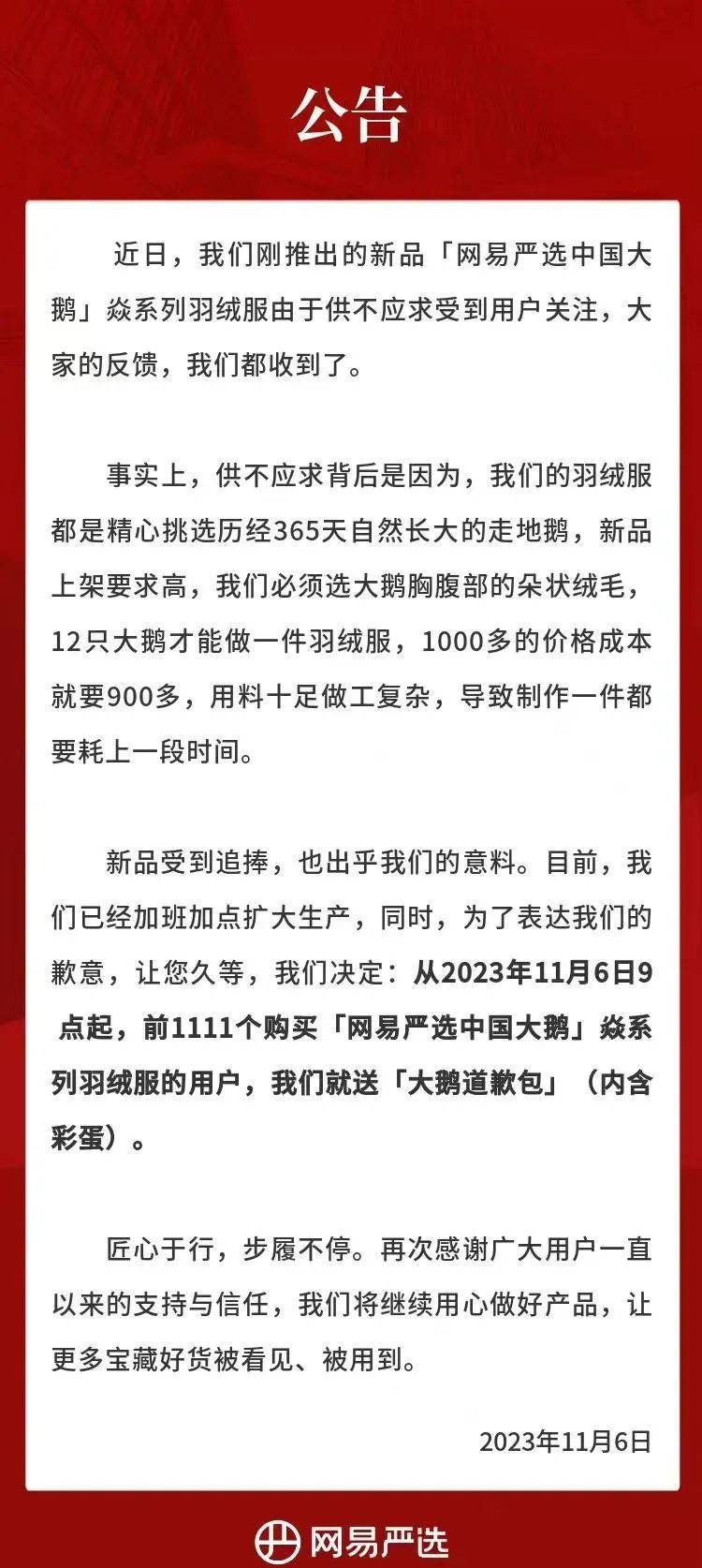 11月6日,网易严选官方发布致歉公告,对热议的国产羽绒服定价千元以及双11期间卖断货表示歉意。公告表示,虽然这款羽绒服要上千元,但成本就要900多,制作工艺复杂,这也导致其供不应求。为了向购买预售的消费者表示道歉和感谢,网易严选将对此做出补偿。