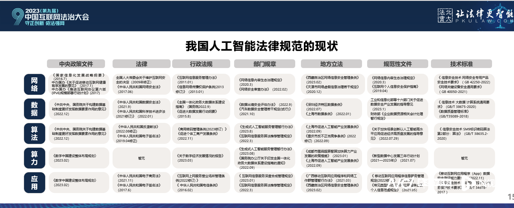 演讲中赵晓海展示国内当前人工智能法律规范现状图表