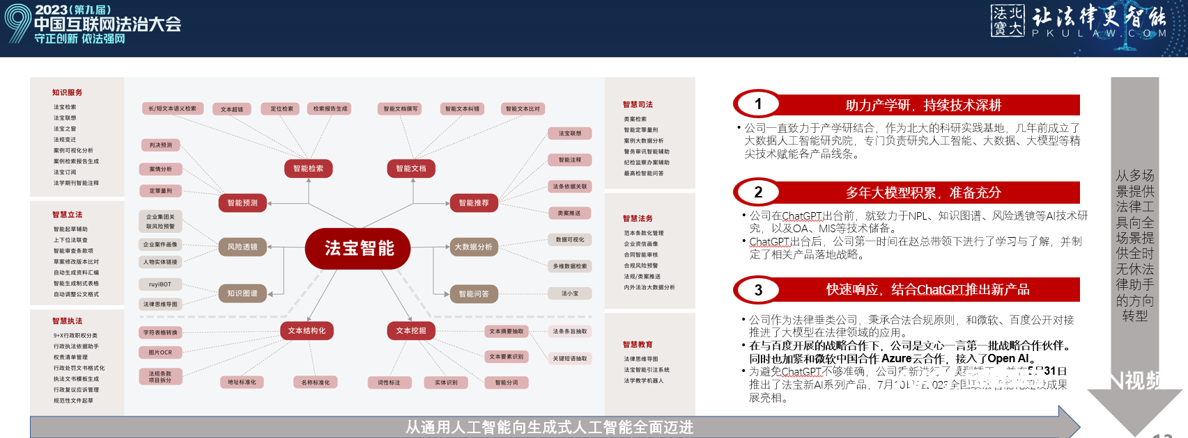“从国内法治来看,我们在网络、数据、算法、算力、应用这五大基础领域正全面加强立法工作,积极稳步审慎推进人工智能立法治理。”赵晓海表示。他同时介绍了通用人工智能在法律领域的逐步应用,展示了北大法宝的立法人工智能应用基础和丰硕成果,并分享了北大法宝参与的多个国家级科研课题,包括在司法部和生态环境部示范应用的人工智能辅助环境法典编纂项目、由北大牵头承接的“跨领域知识驱动的法治调研智能感知及辅助决策技术”项目等。“无论是宏观还是微观,无论是条款还是其周边意见的感知,这一整套技术应用于立法工作中,都可以极大地提高立法的成效和质量。”赵晓海盛赞了立法人工智能在法律文本编纂、分析决策、数据流通中的高实用性。