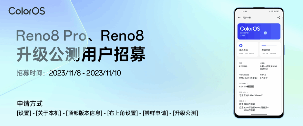 IT之家 11 月 8 日消息,OPPO 今日宣布,Reno8、Reno8 Pro 机型现已开启 ColorOS 14 × 安卓 14 公测招募,报名时间为 11 月 8 日到 11 月 10 日。