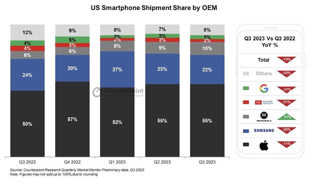 根据Counterpoint Research的市场监测数据,2023年第三季度美国智能手机出货量下降19%。三星、谷歌和TCL的智能手机出货量分别大幅下降26%、37%和51%。而与去年同期相比,摩托罗拉和诺基亚HMD的出货量分别增长31%和17%。苹果公司的出货量相较2022年第三季度下降11%,部分原因是与iPhone 14系列相比,iPhone 15系列的上市时间延迟,致使这部分出货量延后至2023年第四季度。