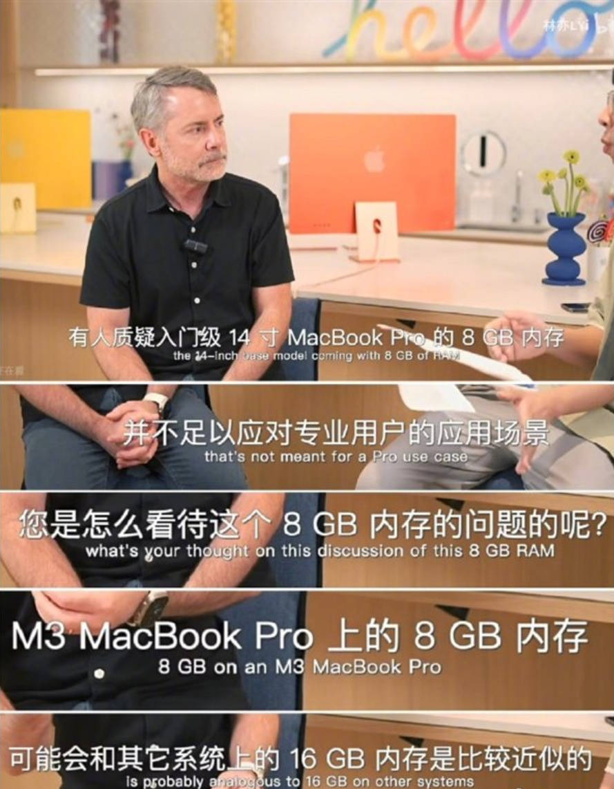 前不久苹果正式发布了搭载M3系列芯片的MacBook Pro系列笔记本,其中M3芯片加持的14英寸MacBook Pro依旧是8GB的内存配置起售,而要升至16GB内存则要再加1500元,如此昂贵的费用被大家吐槽戏称为苹果的黄金内存。最近苹果全球产品营销副总裁Bob Borchers在接受国内博主采访时谈到了这个问题,不过此次官方的回应却引发了用户们的强烈质疑。