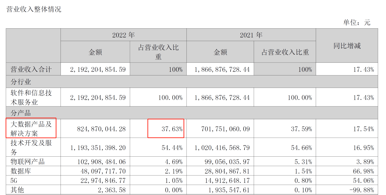 数据业务占比并不低。2022年年报中,公司提到“探索构建工业、军工行业数字化转型能力引擎并形成整体解决方案”,财报显示,当年大数据产品及解决方案占营收比重为37.63%,收入为8.25亿元。