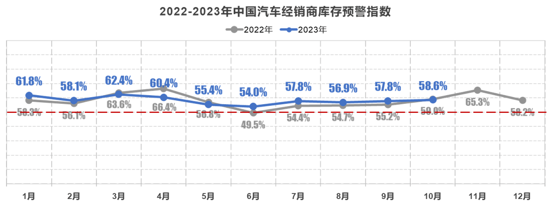 中国汽车流通协会发布的最新一期“中国汽车经销商库存预警指数调查”的数据显示,2023年10月中国汽车经销商库存预警指数为58.6%,同比下降0.4个百分点,环比上升0.8个百分点,库存预警指数位于荣枯线之上,汽车流通行业处在不景气区间。