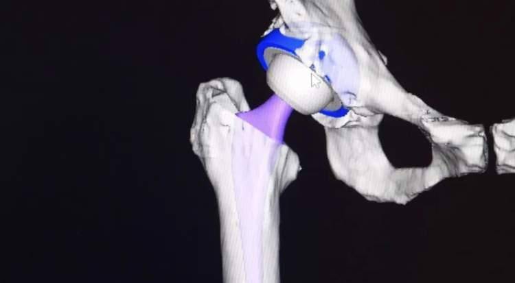 尹峰指着手术机器人显示屏幕向记者介绍:“机器人手术最大的优势就是精确。我们通过CT扫描做出一个3D建模,再通过计算机做一个计划,指导如何安装假体。比如我们要求髋臼外展要45度,前倾要15~20度,那么用机器人辅助手术实施就可以达到精准的结果。”