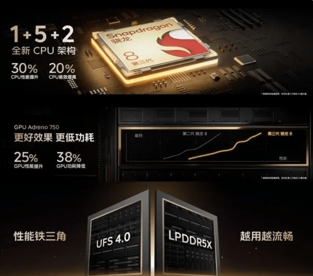 同时,按照iQOO这家智能手机厂商的介绍,iQOO 12系列搭载的屏幕支持全新的LTPO技术,根据画面内容智能匹配刷新率,刷新率调节更迅敏,确保流畅且省电。在核心配置上,iQOO 12系列首批搭载高通第三代骁龙8芯片,并辅以满血版LPDDR5X和UFS 4.0。在今年的骁龙峰会上,高通一如外界预期地推出了第三代骁龙8旗舰移动平台。据悉,第三代骁龙8采用4纳米工艺制程,其CPU最高主频达3.3GHz,性能提升30%,能效提升20%;AI性能提升98%,能效提升40%;游戏性能与能效均有25%的提升。