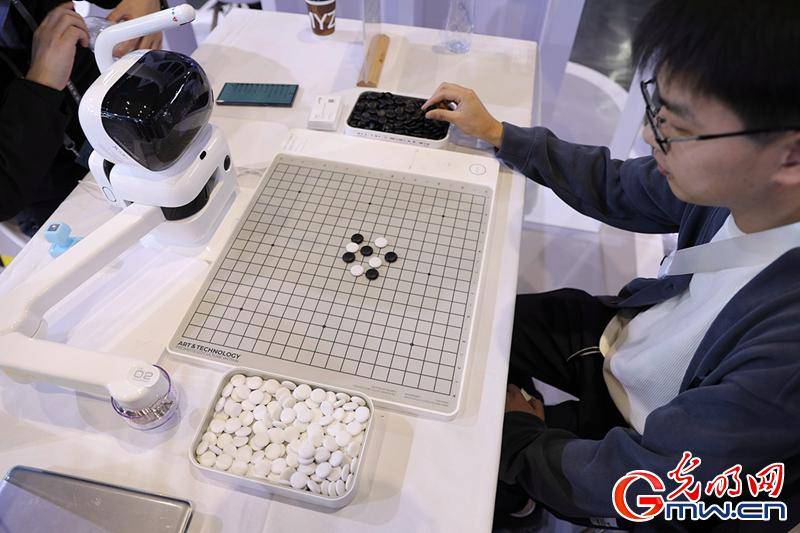 商汤科技推出的全球首个家用AI下棋机器人,融合了人工智能技术和高精度机械臂技术,实现“手眼协同”,可以在真实棋盘上与人对弈。图为2023年11月7日,游客在“互联网之光”博览会与机器人下围棋。(光明网记者崔益明/摄)