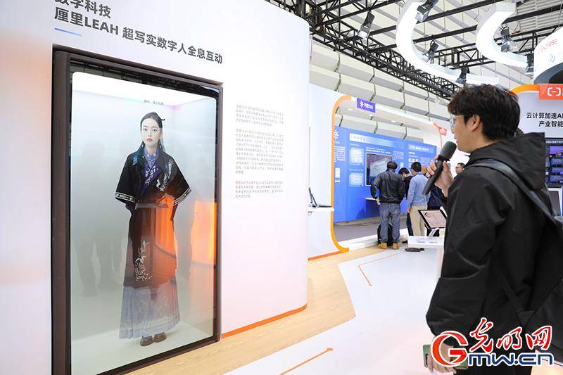 在真人漫改剧《异人之下》中,角色“二状”是数字人饰演的;在纪录片《风气东方》中,数字人与XR、AI技术结合,打造了一场跨时空丝绸之路探寻之旅。她,便是阿里推出的首个超现实数字人厘里LEAH。图为2023年11月7日,游客在“互联网之光”博览会上与超写实数字人厘里互动。(光明网记者崔益明/摄)