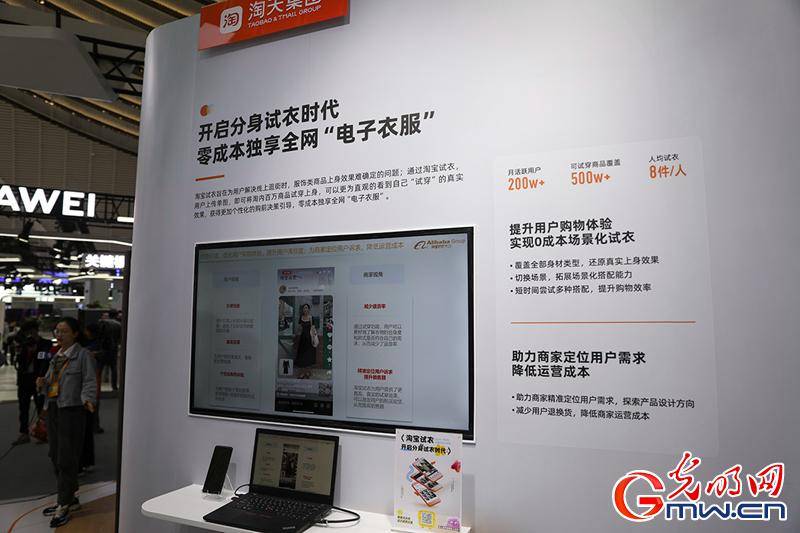 购买服饰类商品上身效果难以确定,是网购中一大痛点,阿里推出的淘宝试衣只需上传一张照片,便能直观地看到自己“试穿”的效果。图为2023年11月7日,“互联网之光”博览会上展出的淘宝试衣。(光明网记者崔益明/摄)