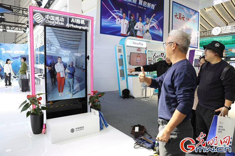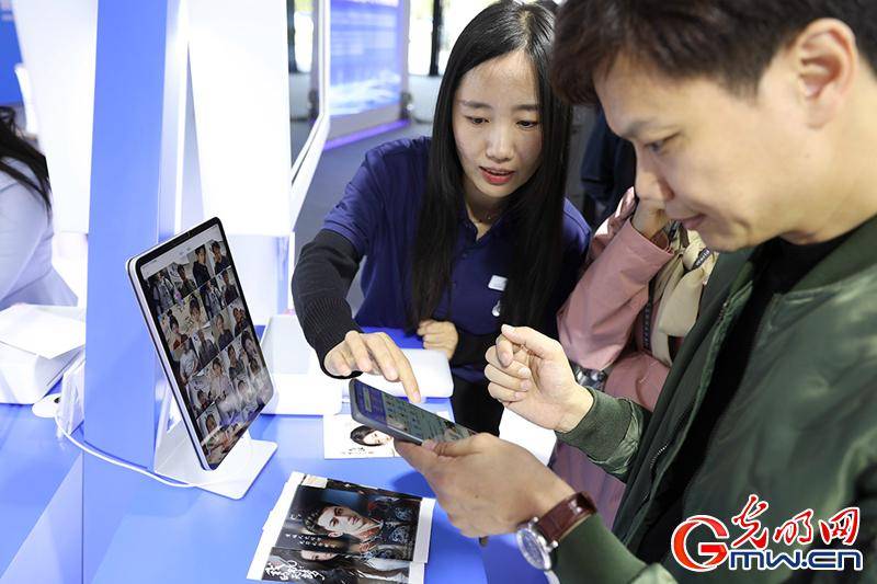 2023年11月7日,游客在“互联网之光”博览会记者体验中国移动的“AI拍机”,一秒实现和奥运冠军合照。(光明网记者崔益明/摄)