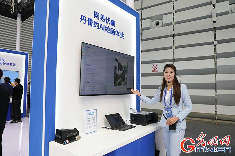 基于中文文生图大模型,网易伏羲丹青约AI绘画只需输入几个中文关键词便能在数秒内生成一幅高质量画作。图为2023年11月7日,“互联网之光”博览会工作人员在介绍AI绘画技术。(光明网记者崔益明/摄)