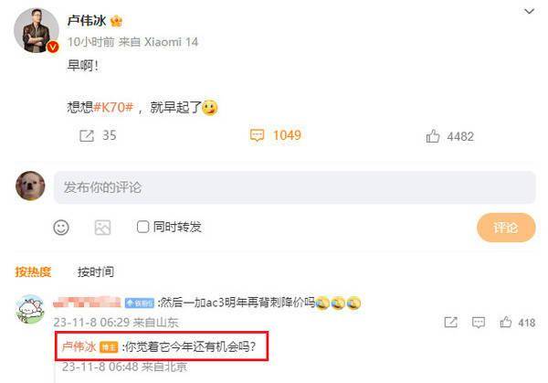在卢伟冰为Redmi K70系列发布的诸多预热微博中,最有趣的是卢伟冰最新发布的一条微博。11月8日,卢伟冰在最新一条微博中写道:早啊!想想K70,就早起了。底下有网友评论称:然后一加Ace 3明年再背刺降价吗?